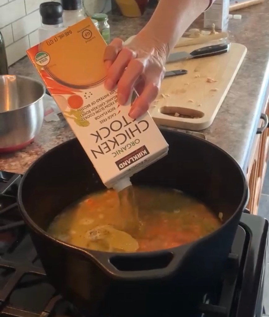 Add 8 cups of chicken stock and shredded chicken, bring to a boil. Turn down heat and allow soup to simmer for 30 minutes on low.