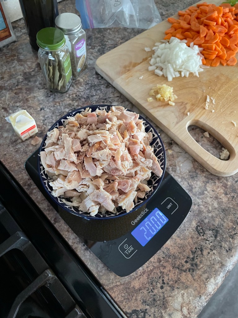 Shred 1 lb (16oz) of cooked chicken. Mom adds more because Dad gets more protein on his BLE plan. We recommended Costco’s rotisserie chicken. Good flavor, easy shredding, and so reasonably priced!