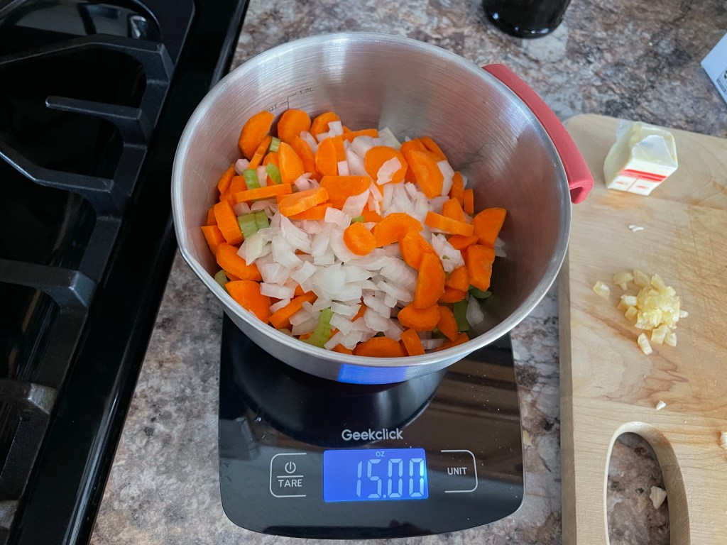 Chop 15oz of vegetables: approximately 3 large carrots, 2 celery stalks and 1/4 of a yellow onion. Melt 2 tbsp of butter in a large Dutch oven and sauté vegetables over medium/low heat for 7-8 minutes. Add in 3 cloves of garlic minced and sauté for 30 seconds. Now add your spices: 2 bay leaves, 1/4 tsp dried thyme, salt and pepper to taste.