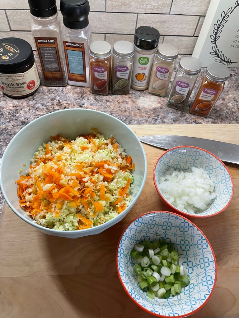 Start with preparing your vegetables. These should total 16oz. Dice a 1/4 onion, shred 1/4 head of green cabbage and 2 carrots. Slice up 2 green onions.