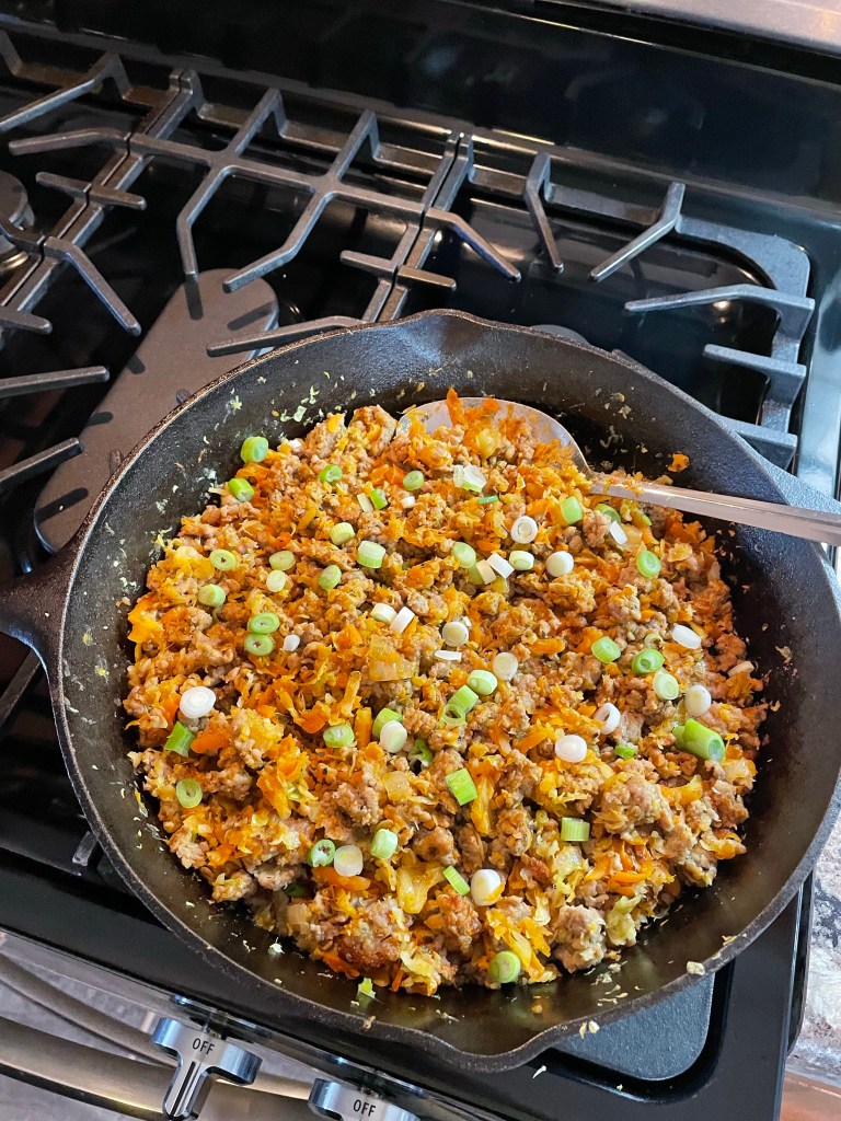 Brown 1 lb (16oz) of NO SUGAR sausage in a large skillet on medium heat until no longer pink. Stir in cabbage and carrots and sauté for 3-4 minutes. Add a tsp of chicken bouillon and 1/2 a cup of vegetable broth or water. Cook for 2 more minutes.
