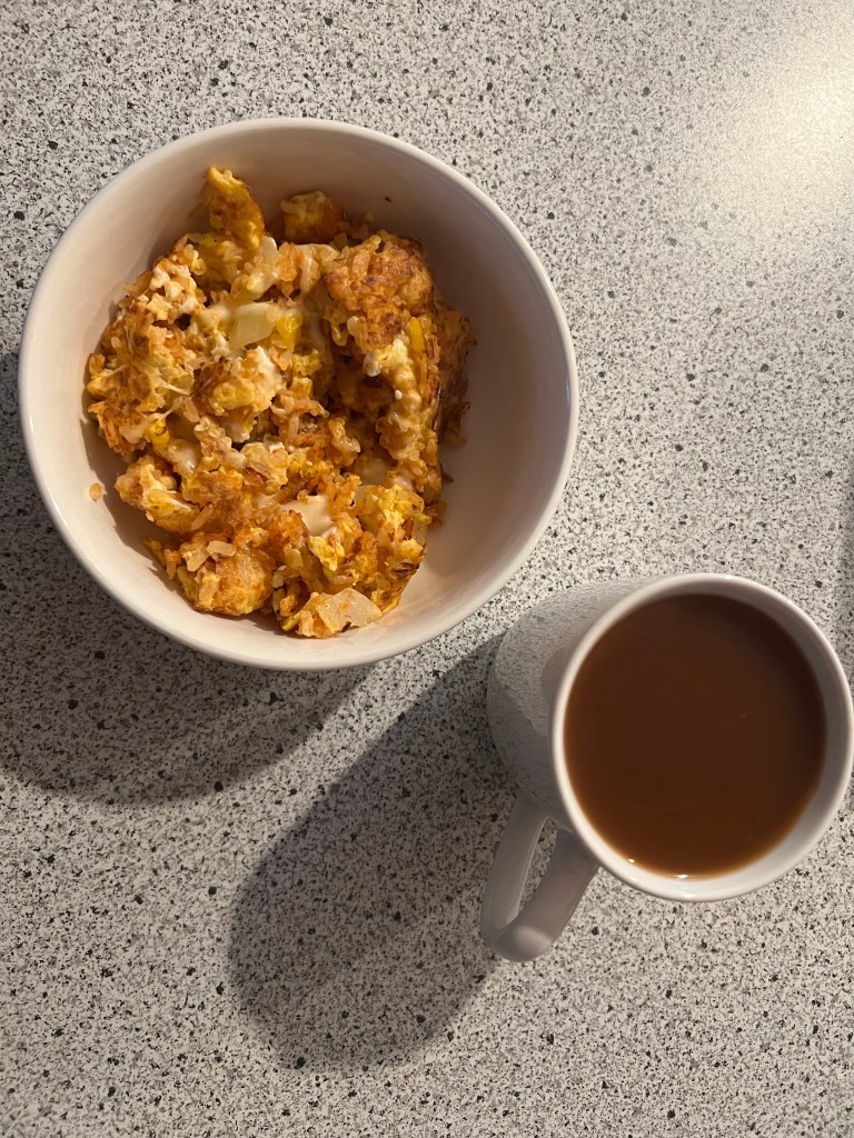 Start by heating a skillet to medium-high heat. Add in 4oz of cooked rice. Toast this for a couple of minutes, or until rice starts to get brown and crispy. I then added in 2 eggs that I whisked in a bowl. Cook to your desired doneness, add whatever spices you like! With 6oz of fruit this makes a complete BLE women’s weight loss portion breakfast. Recipe to follow.