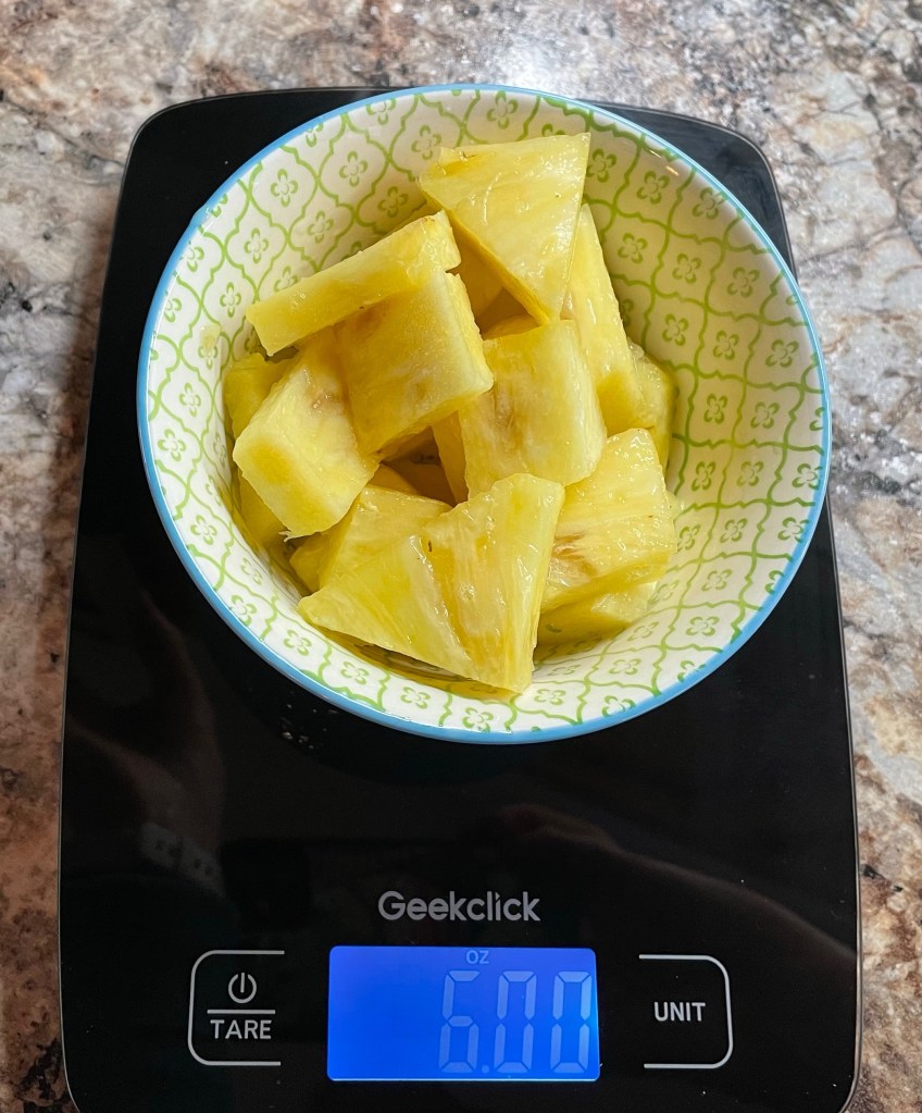 With 6oz of fruit – pineapple pieces pictured here, this makes a complete BLE women’s weight loss potion lunch. Recipe to follow.