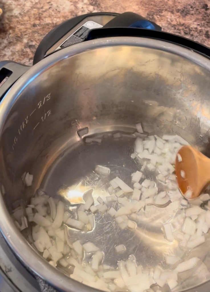 Start by sautéing 1/4 of a large yellow onion in 2 tbsp of coconut oil. In the InstantPot sauté for 5 minutes on high.