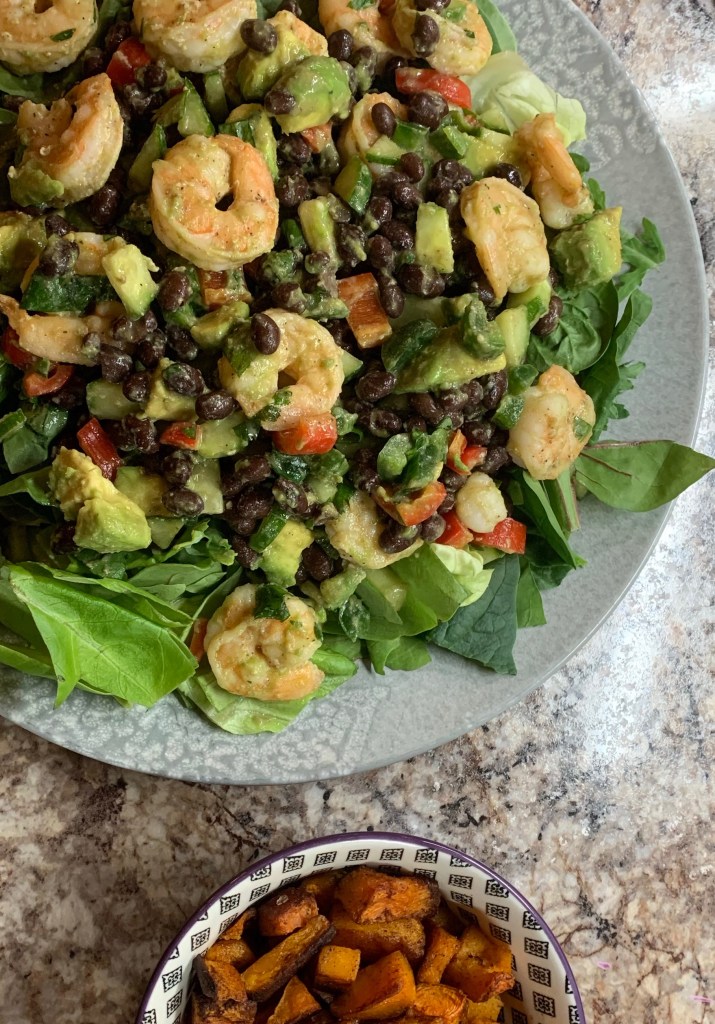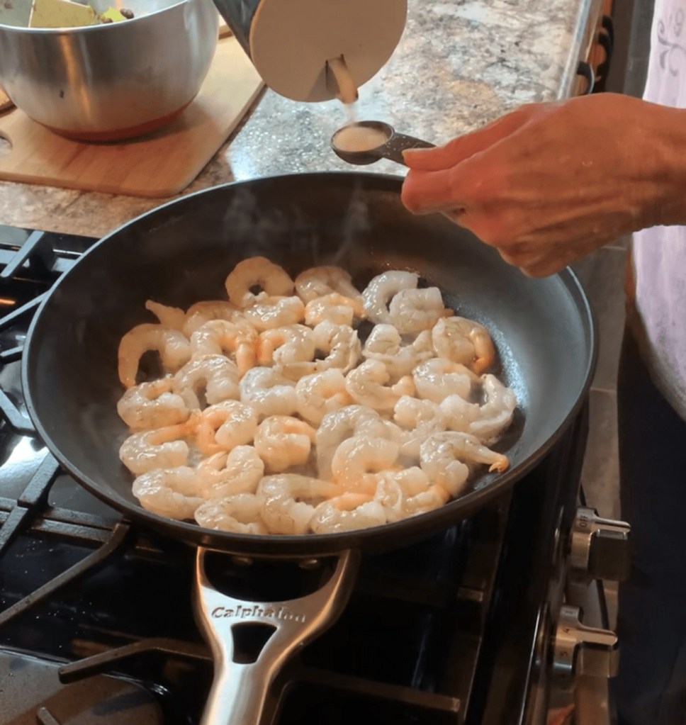 Start with a little olive oil in a skillet – heat to medium. Place 16oz of shrimp in the pan and season with 1 tsp salt, 1/4 tsp pepper and 2 tsp cumin. Cook for 2 minutes.
