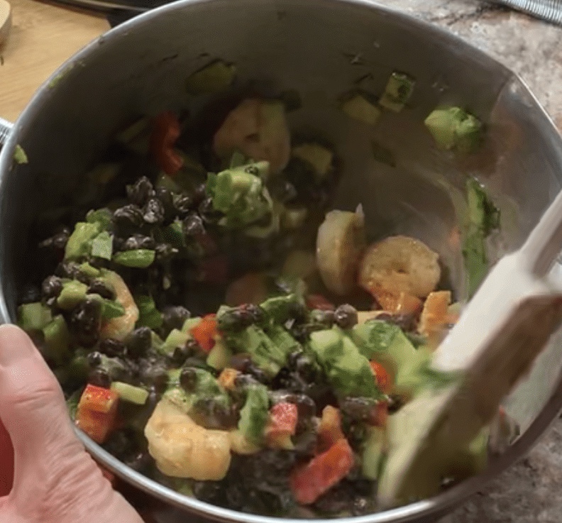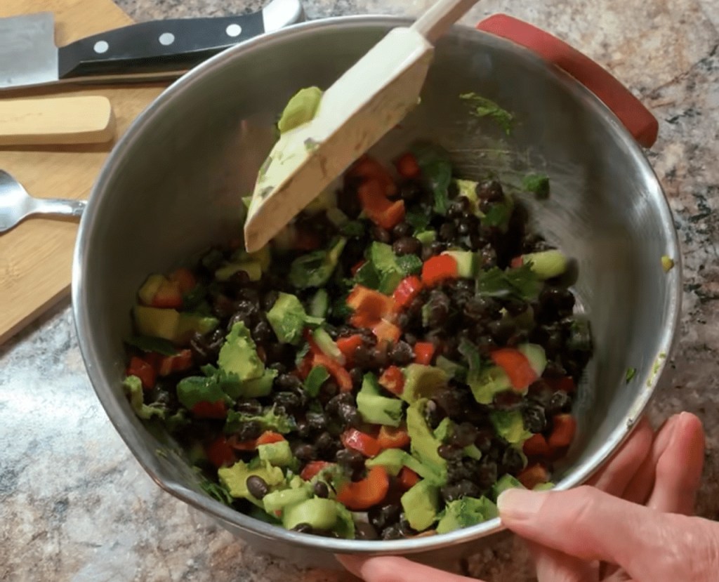 Mix black beans, avocado, jalapeño, red pepper, cucumber and cilantro.
