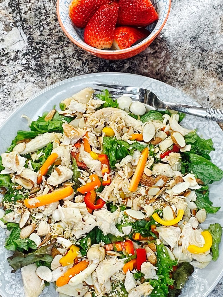 Build your salad out of whatever veggies you like. We suggest: red bell pepper, scallions, carrots, and mushrooms. You can also choose your lettuce, or use kale and spinach as well. Once you have your salad assembled (before the chicken and nuts) toss with tamari and lime juice.