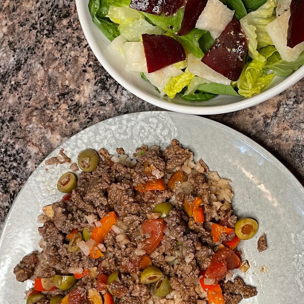 Microwave on bag of frozen cauliflower rice. This recipe makes 4 servings. One serving equals your full protein (4oz ground beef) and 7oz of your vegetables (4oz cauliflower rice and 3oz included veggies) add a 7oz salad and you have a complete BLE women’s weight loss portion dinner. Recipe to follow.