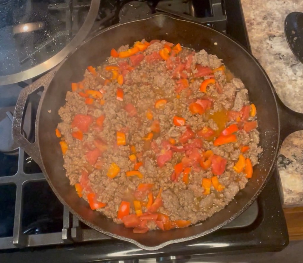 Add 1 chopped red pepper, 1 (14oz) can diced tomatoes, 1 1/2 tsp salt, 1/4 tsp ground cinnamon, and 1/8 tsp. ground cloves. Cover the skillet and simmer for 10 minutes.