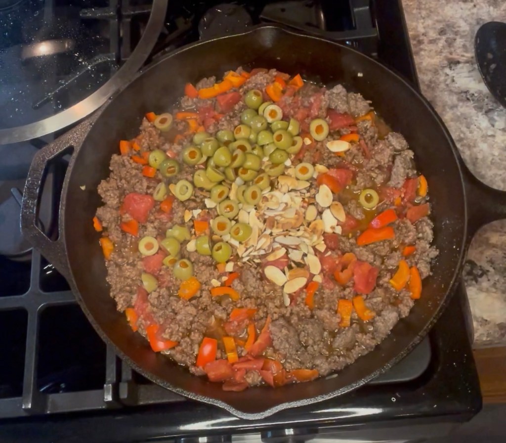 Stir almonds and olives into beef mixture. Heat through 3-4 minutes.