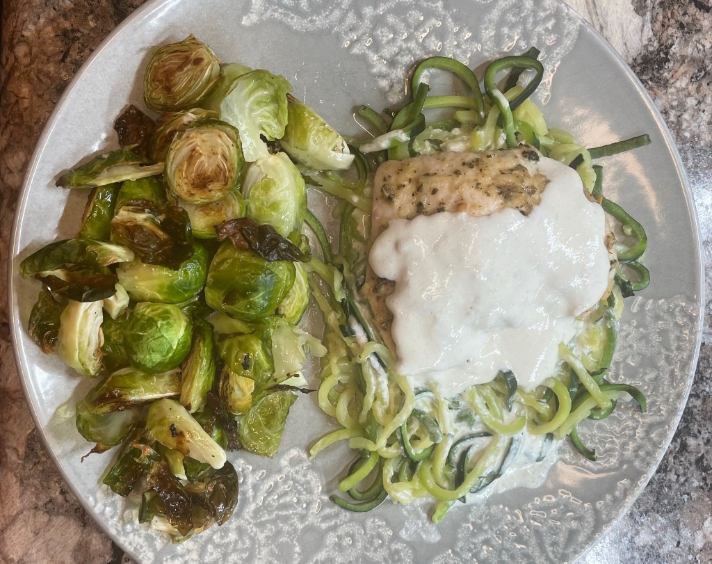 Heat the sauce in a sauce pan. While the sauce is heating cook zucchini noodles to package directions. Toss the noodles in half the sauce. Plate the noodles, chicken (rest for 5 minutes after baking) and additional sauce. Add another vegetable to have a complete BLE women’s weight loss portion dinner. Recipe to follow.