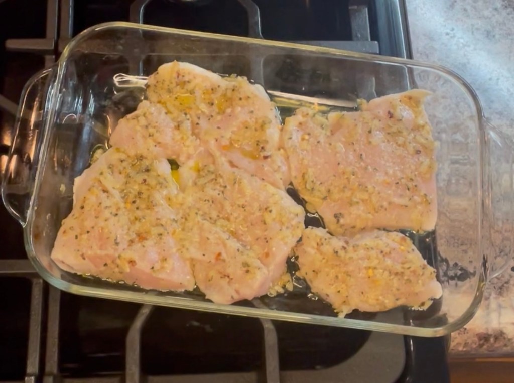 Start by marinating 1lb of chicken breasts in 2 tbsp olive oil, 1 tbsp apple cider vinegar, 1 tsp garlic powder, 1/2 tsp oregano, 1/2 tsp onion powder, 1/8-1/4 tsp crushed red pepper, 1/2 tsp salt, 1/4 tsp pepper, 7oz Parmesan cheese for 25-30 minutes. Bake in a 375 degree oven for 20-25 minutes.