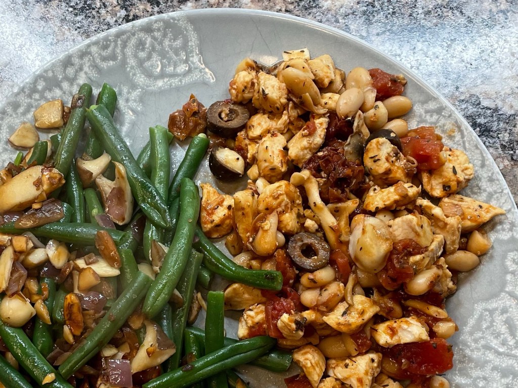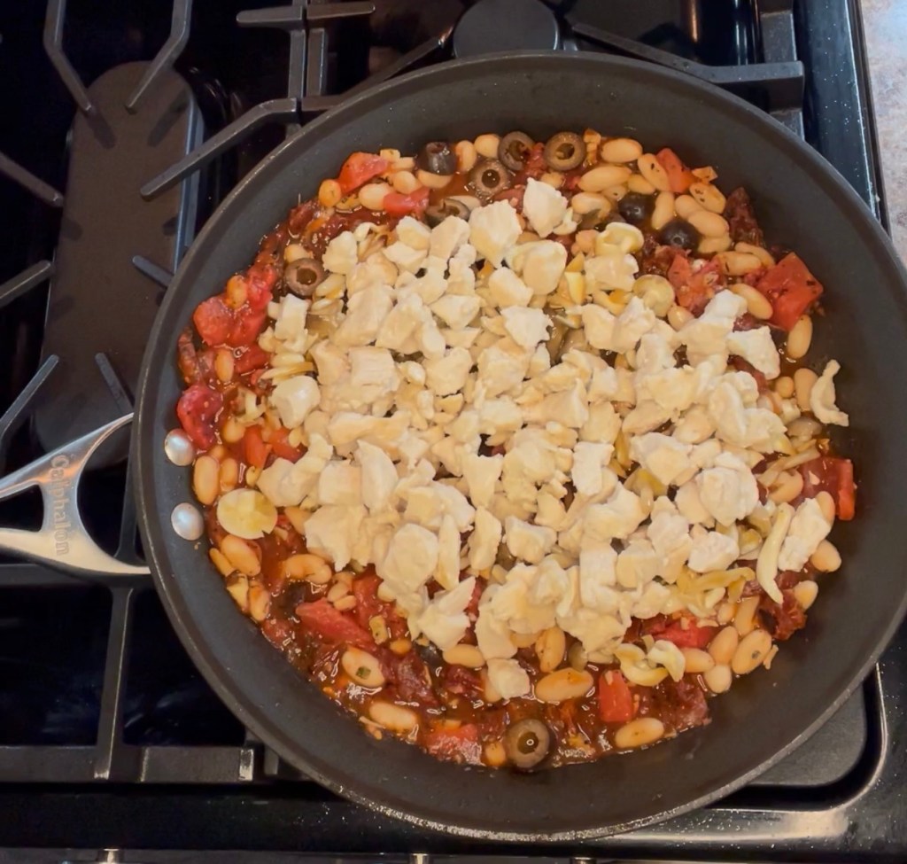 Add in sun-dried tomatoes, rinsed and drained white beans, diced tomatoes and black olives and allow to simmer for 3 minutes. Next add chopped onions, balsamic vinegar, salt and pepper and combine.