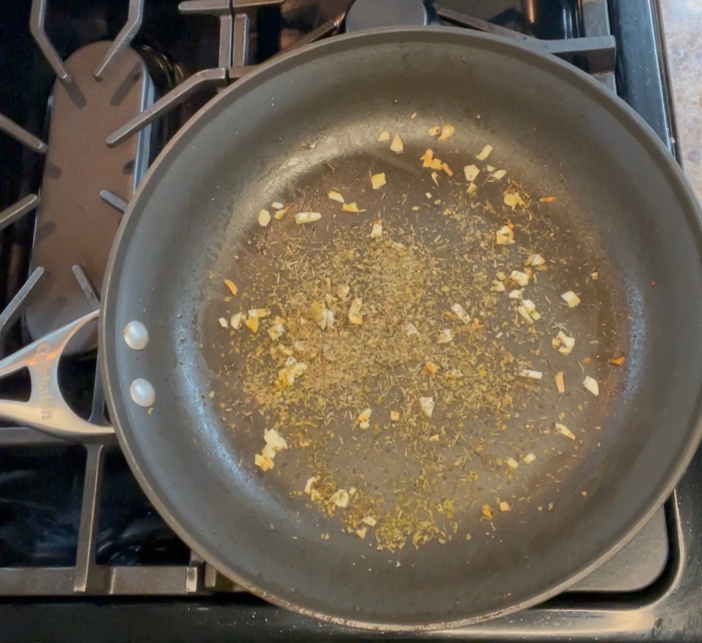 Use 1 tsp of the oil that the sun-dried tomatoes are packed in and toast the minced garlic, basil, oregano and thyme until just fragrant.