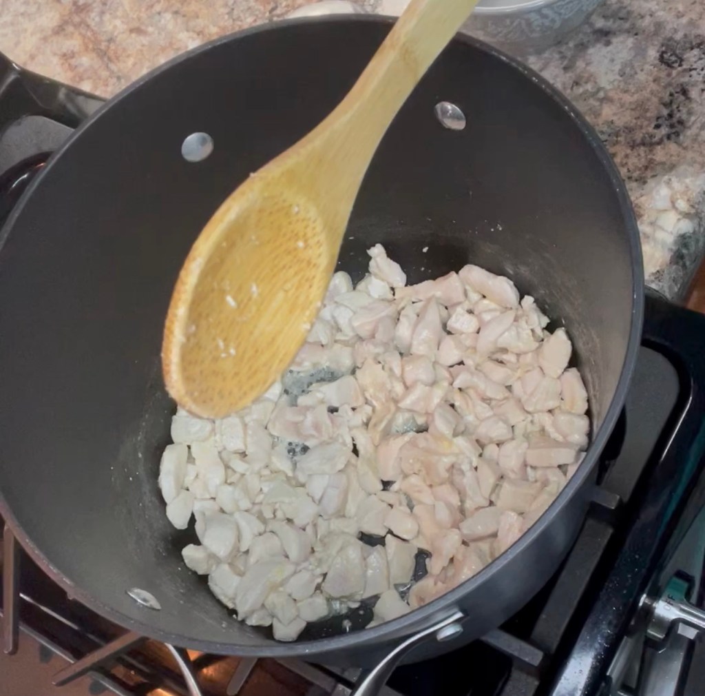 Add 1 tbsp of olive oil to your Dutch oven and cook your 24oz of chicken. Breast or thighs are both good to use! When chicken is cooked through remove from pan.