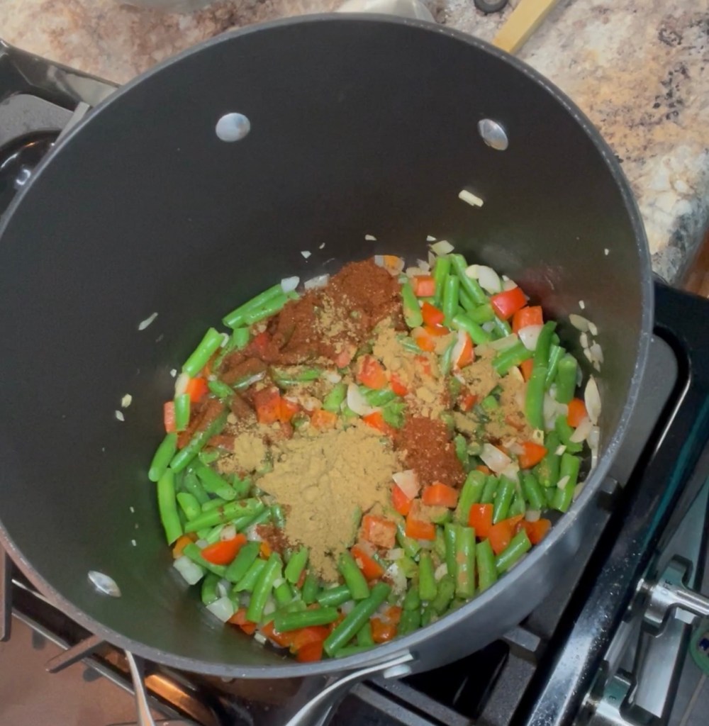 Add 1 more tbsp of olive and and cook your veggies. 1 onion, 1 red bell pepper, 1 1/2 cups fresh green beans and 4 cloves garlic, minced. Cook these for 5-7 minutes.