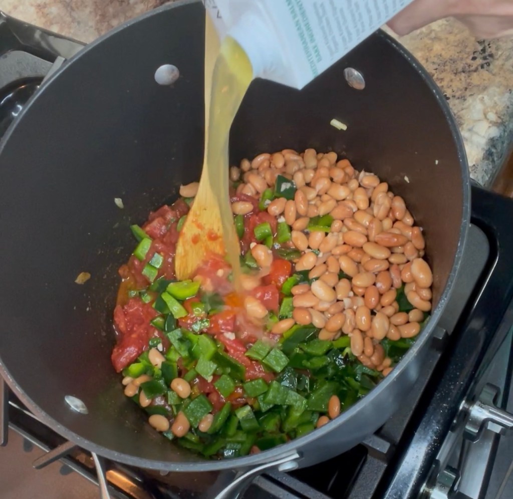 To the vegetables and spices add two 14oz cans of diced tomatoes, 2 roasted, seeded and diced poblano peppers, a 15oz can of rinsed and drained pinto beans, and 8 cups of chicken broth. Bring this to a boil and then reduce heat to low and simmer for 15 minutes.