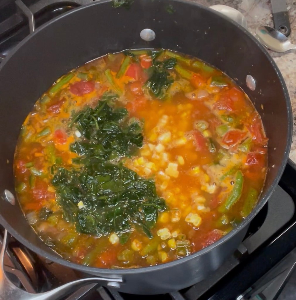 Add chicken and the juice from the chicken, spinach and corn. Simmer for 15 minutes.