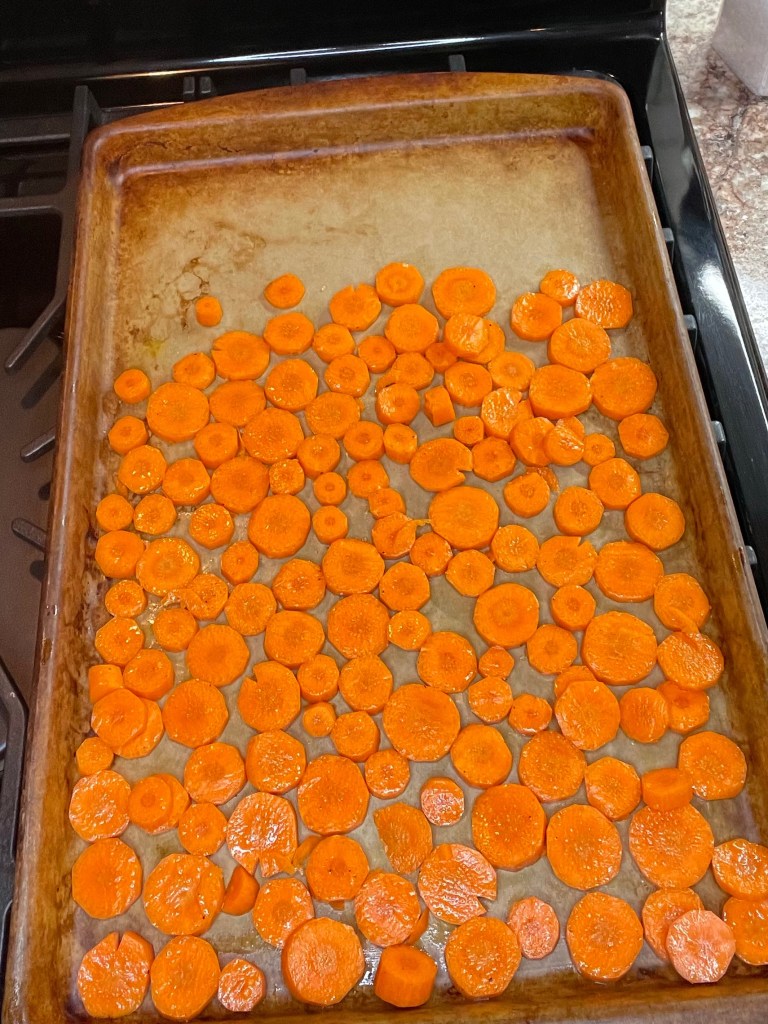 Start by peeling and slicing 1lb of carrots. Toss them in 1tsp of olive and and season with salt and pepper. Spread out evenly on a sheet pan and bake in a 400 degree oven for 15 minutes.