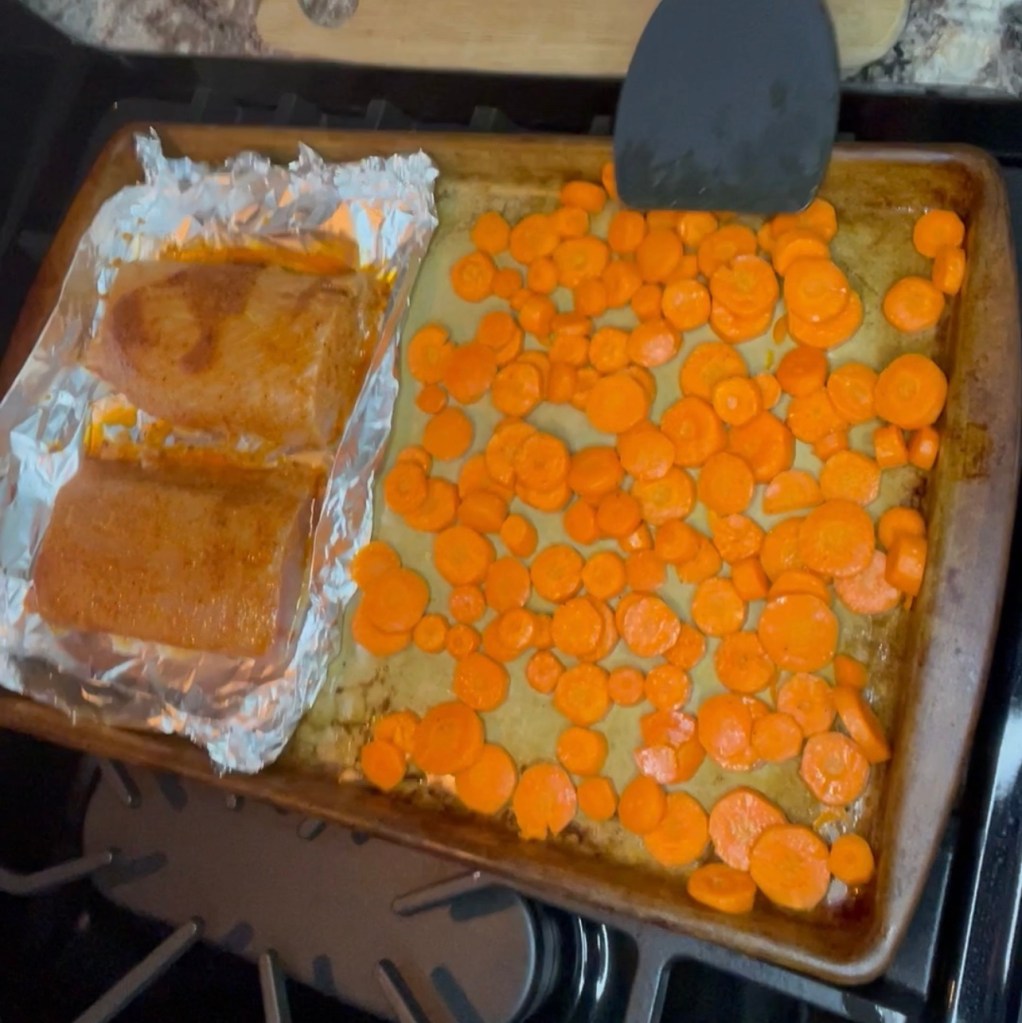 This recipe is a great one sheet meal. You can finish baking the carrots and bake the fish at the same time!