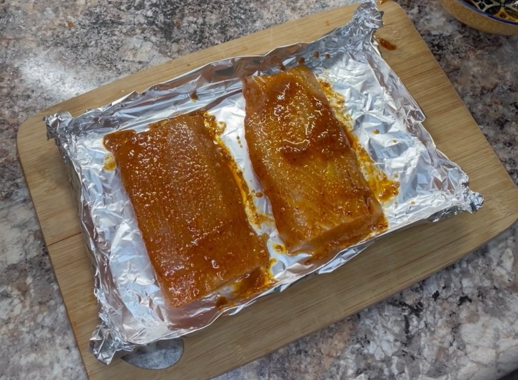 Using foil, make a small tray to cook the fish. Place fish in foil tray and generously brush spice mixture over fillets.