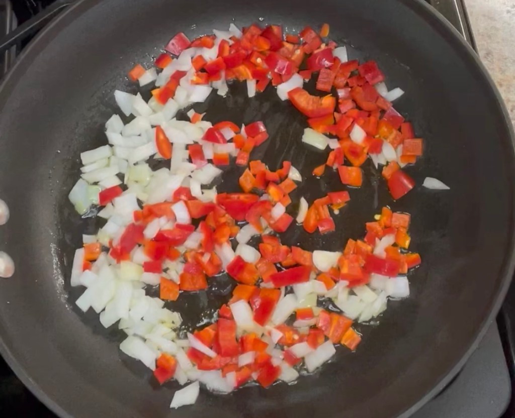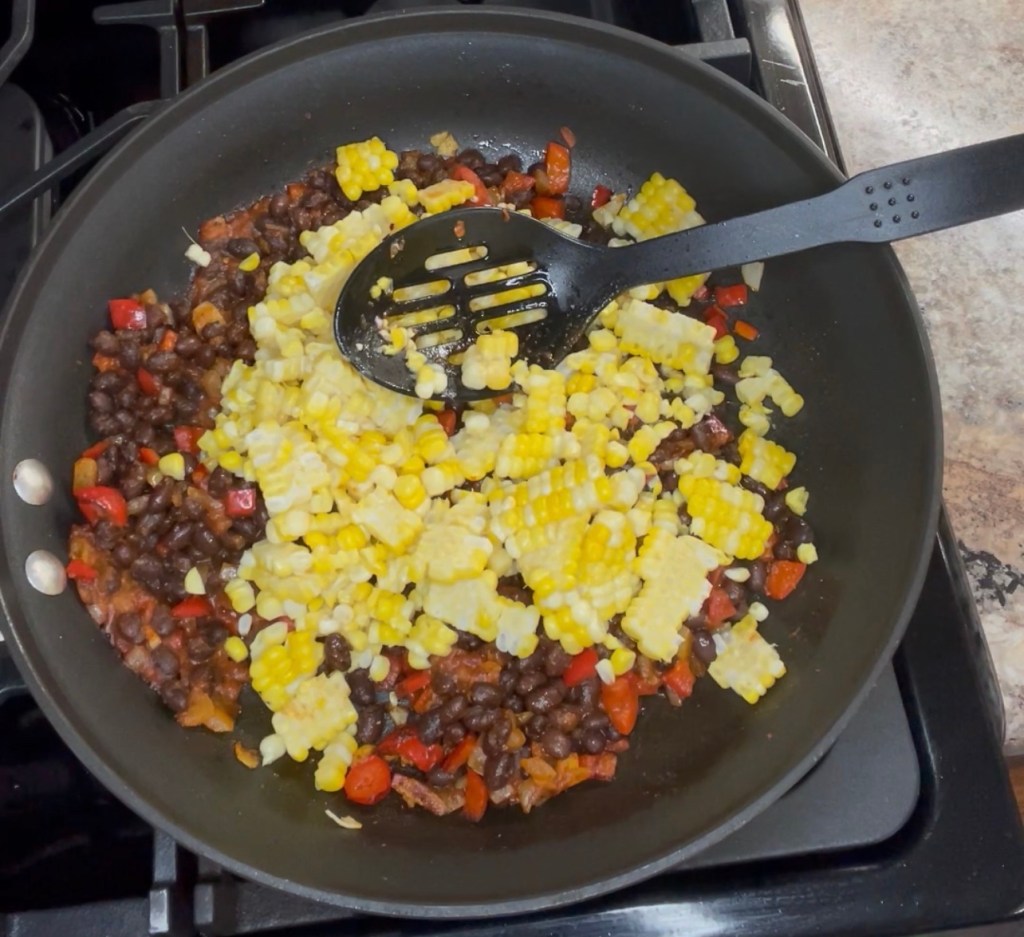 While sweet potatoes are roasting, sauté 1/2 a finely diced onion, 2 cloves of minced garlic, and 1/2 a finely chopped red bell pepper in 1 tbsp of olive oil. Cook for 3-5 minutes. Next season with salt, pepper, 1 tsp of taco seasoning and 4 tbsp of salsa.