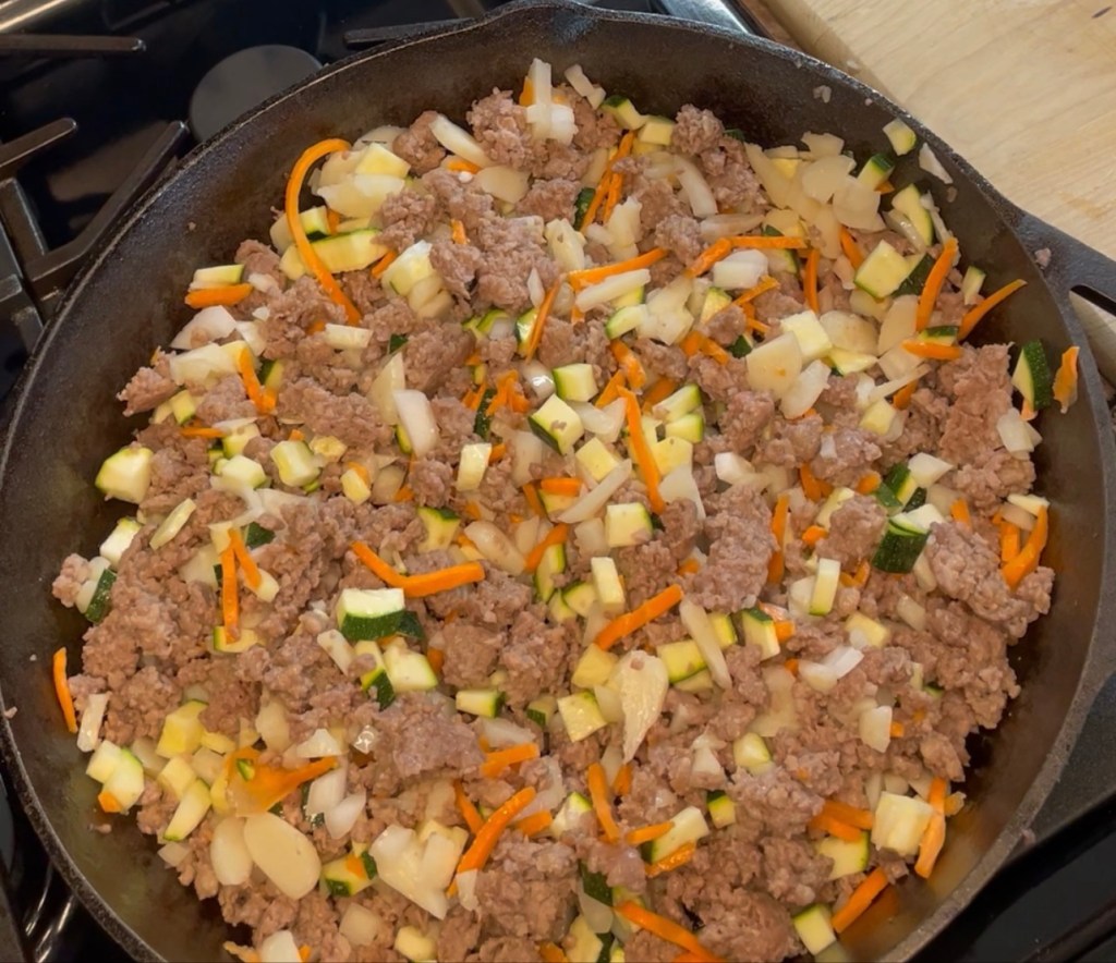 Add to the skillet 1 small zucchini, diced, 8 oz can water chestnuts, drained and roughly chopped, 1/2 yellow onion, diced and 1/2 cup shredded carrots. Sauté for 5-7 minutes, until vegetables are tender. Add in the sauce that you made at the beginning, reduce heat to medium low and allow to simmer for 5 minutes.