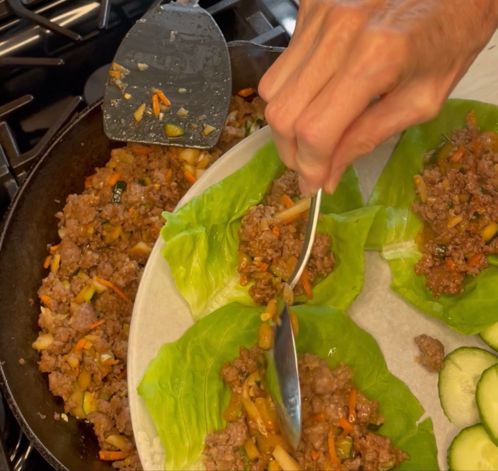 Serve in butter lettuce leaves and garnish with sliced green onion.