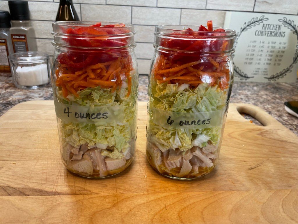 Mason jar salads are a great way to food prep lunches OR dinners. These store for up to 3 days in the fridge. These are complete BLE meals depending on the quantity of veggies. 6oz veggies + 6oz fruit would make this a complete lunch. Bulking up the veggies to 14oz will make this a complete BLE dinner!