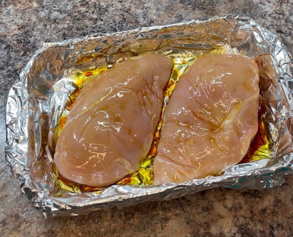 Line a baking dish with foil and place chicken in the dish. Cover the chicken with 1 tbsp olive oil and 2 tbsp tamari sauce.