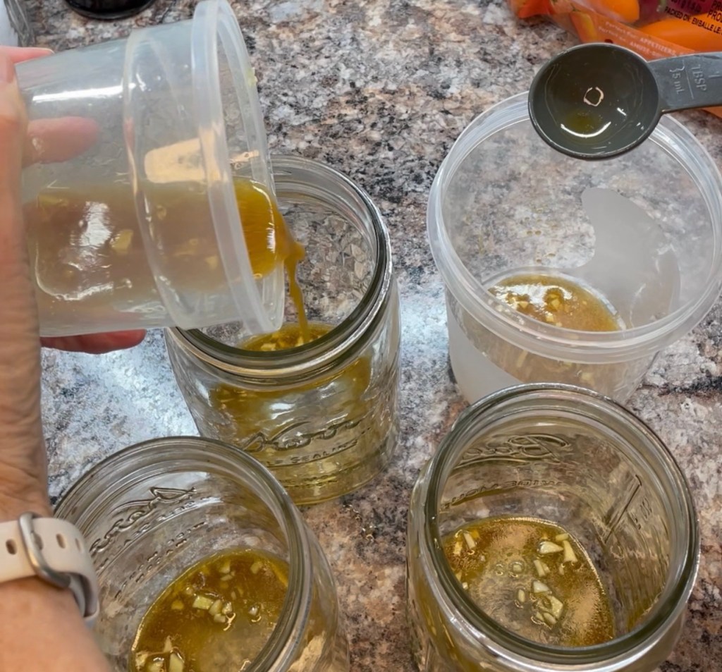 Divide the vinaigrette evenly between 4 mason jars. I had approx. 1.5 tbsp per jar.