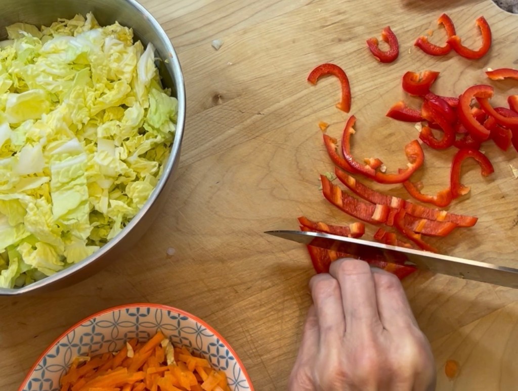 Chop Napa cabbage, red bell peppers and shred carrots. For lunch portion these veggies would equal 6oz. You can bill up to 14oz for dinner portion or add another veggie on the side for dinner.