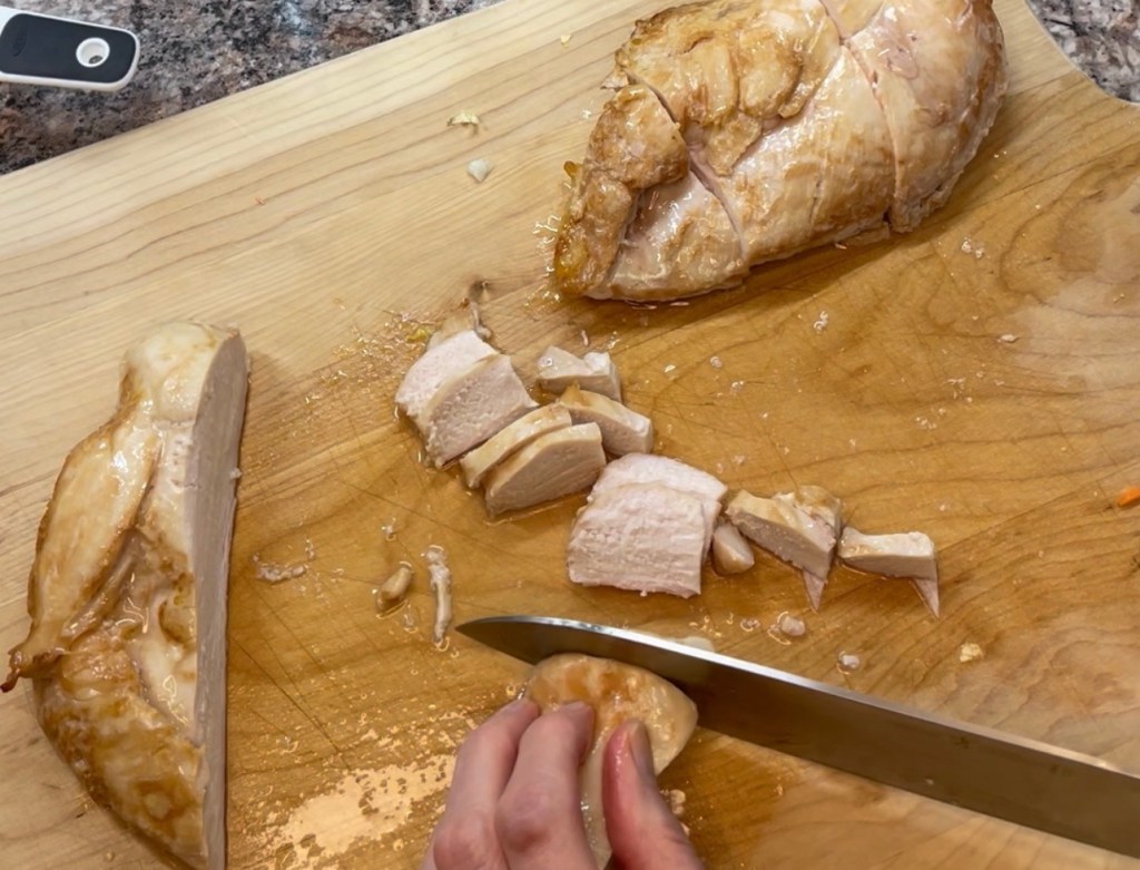 Slice the chicken and weigh out portions. 4oz for weight loss, 6oz for enhanced weight loss.