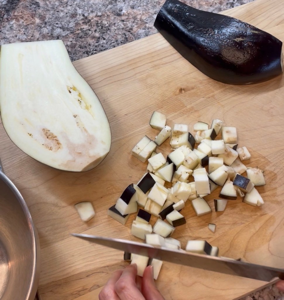 - 1 large eggplant (about 9” long, cut into 1/2 inch cubes