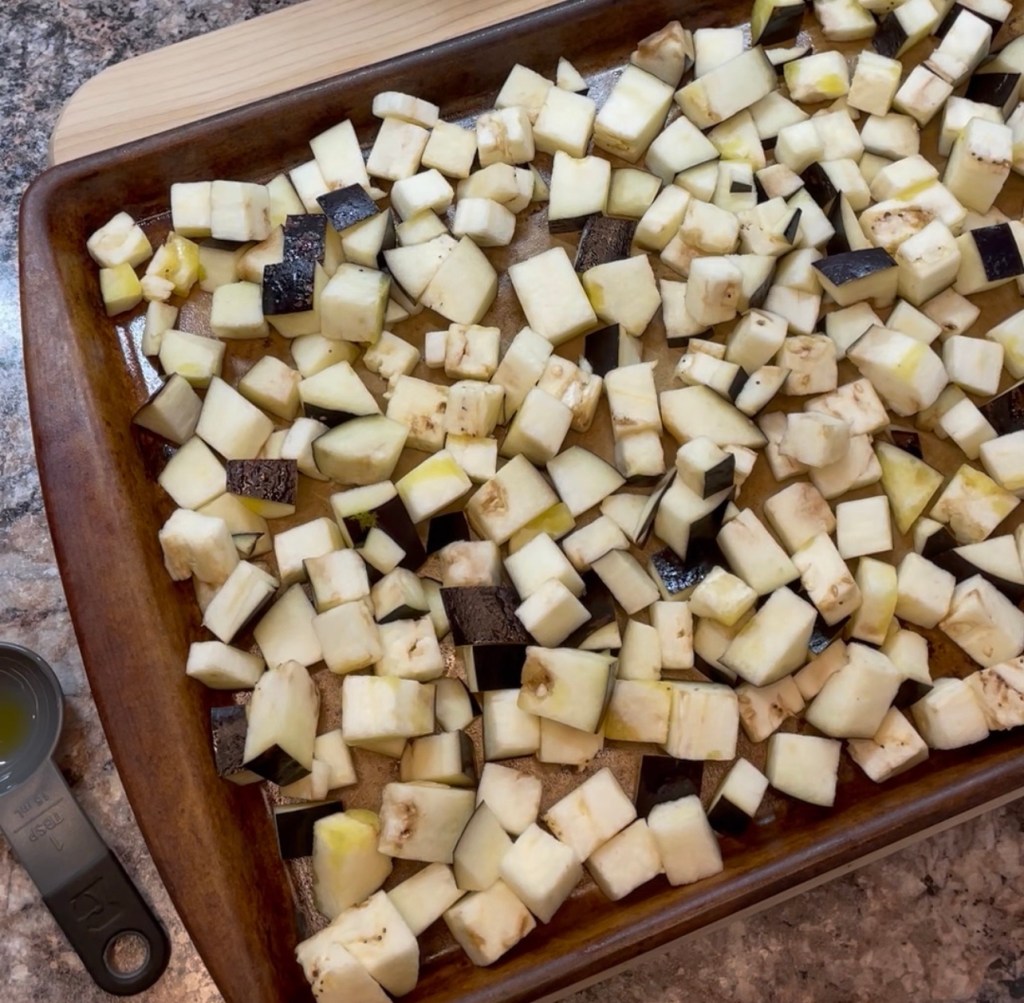 Cube an eggplant into 1/2 inch cubes. Toss the eggplant with 1 tbsp of olive oil.