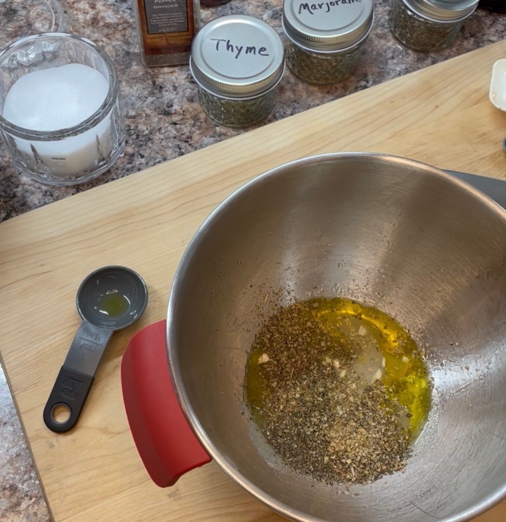 Meanwhile, combine the remaining olive oil, vinegar, garlic, salt, pepper, herbs and lemon juice in a large bowl.