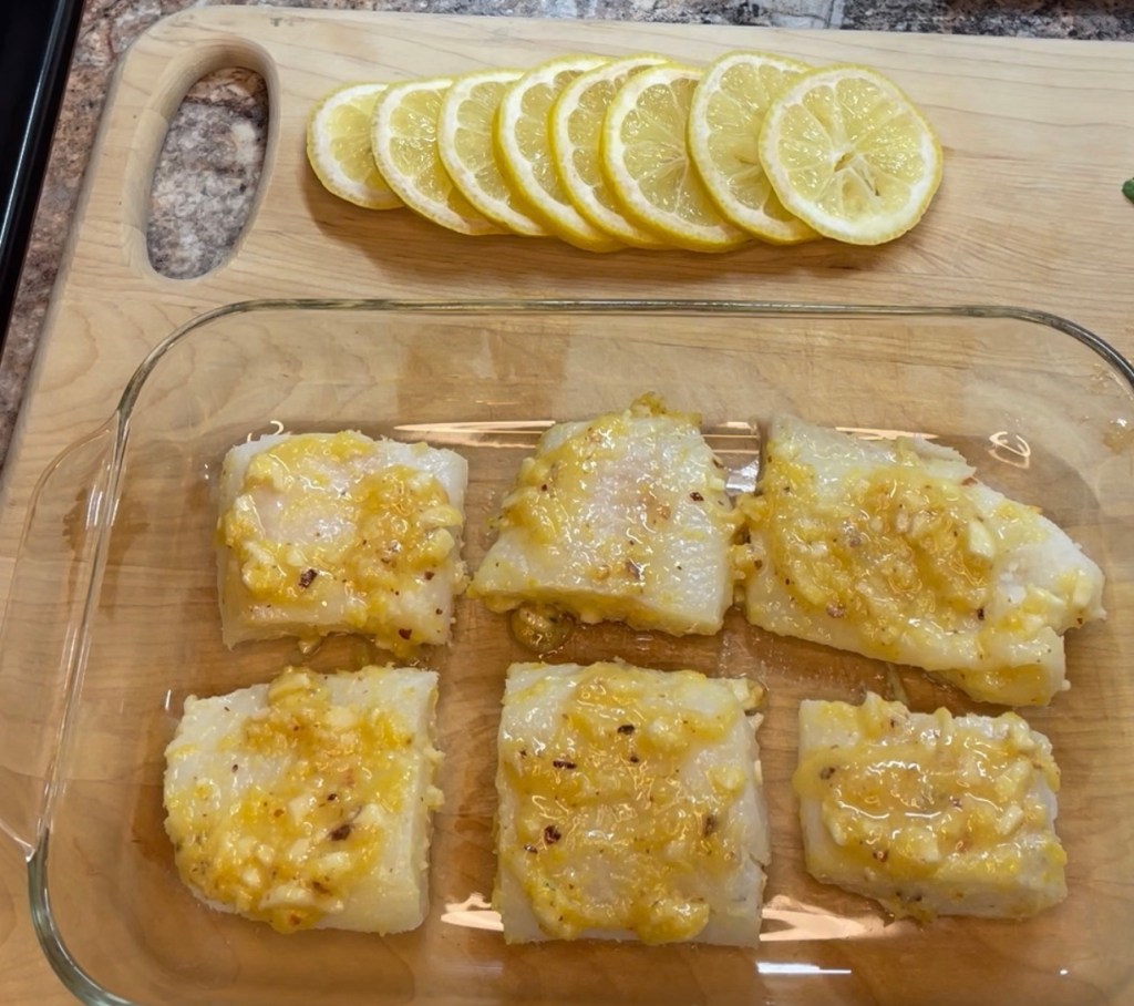 Mom says “This is my new favorite way to eat cod. It’s lemony, garlicky, super easy to make and elegant enough for a romantic dinner ❤️”
